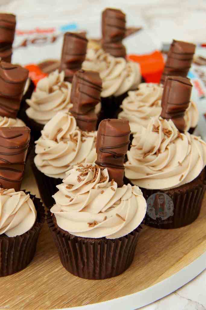 - Decorate your cupcakes how you like, I stick in half a bit of kinder bueno each, and sprinkle on some chocolate sprinkles – and ENJOY!