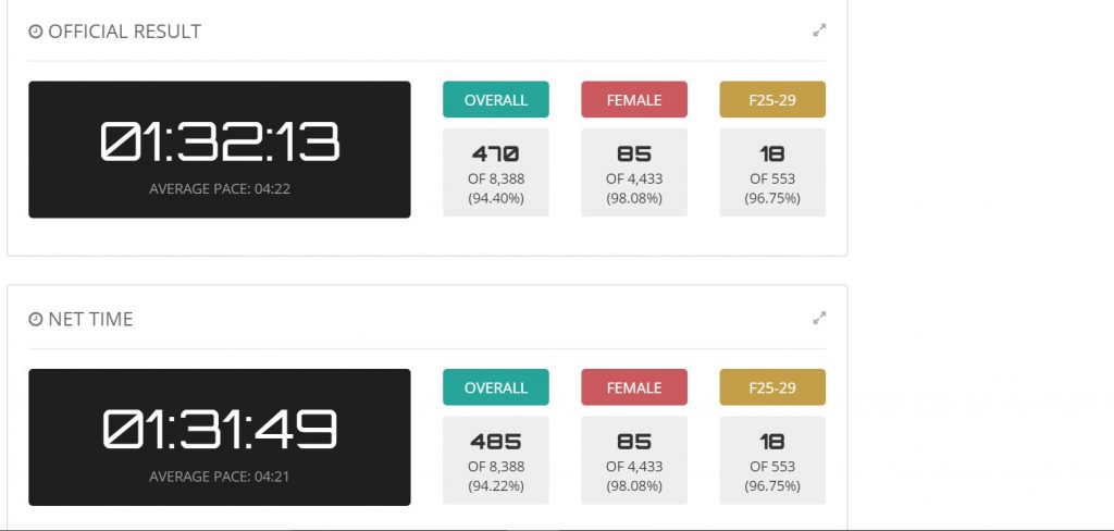 Samantha Woodland – 21kms in 1:31:49, finishing 18th in her AG out of 553 girls!